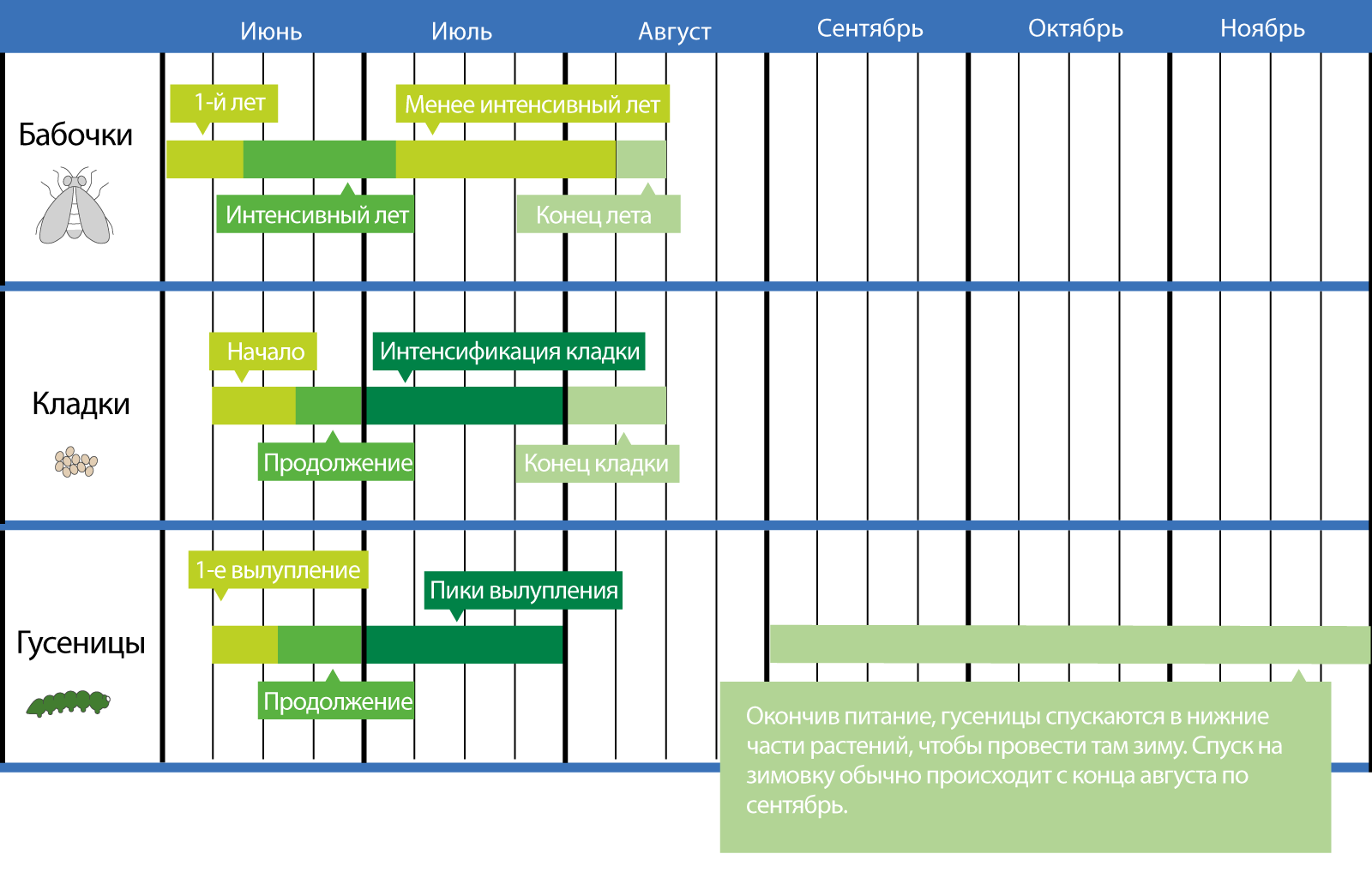 На продолжительность лета бабочек влияют погодные условия, которые могут сокращать или увеличивать его. Но во всех случаях лет растягивается на длительный период, что усложняет борьбу с вредителем.