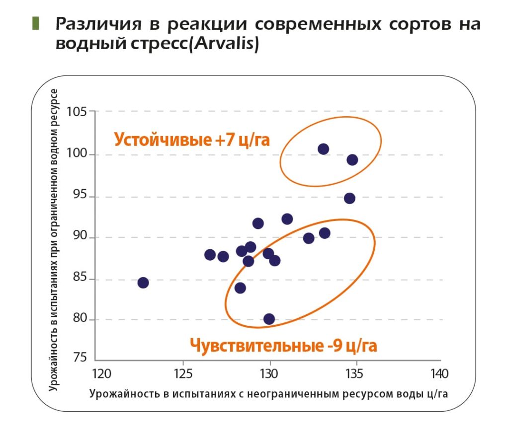 (« эластичность »). Испытания с целью определения устойчивости к стрессу показывают разницу в урожайности сортов, которая может достигать до 15 центнеров. Следует заметить, что смена группы спелости значительно не изменяет потребности в воде: выбор более ранней группы спелости помогает сэкономить не более 10 мм (100 м3) на протяжении всего цикла орошения. Более ранние сроки посева также не приводят к уменьшению общего расхода