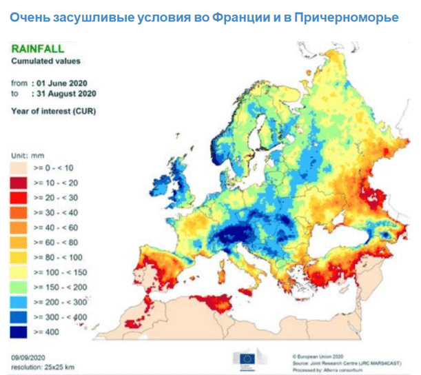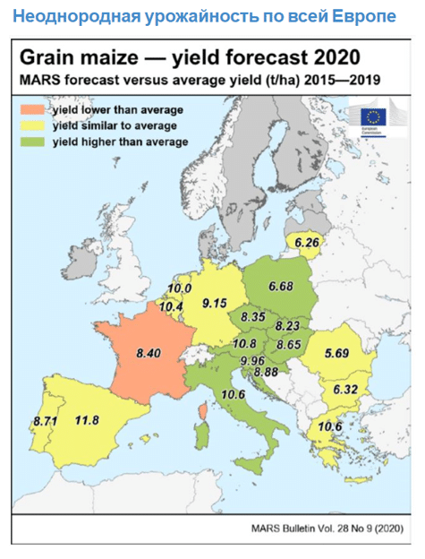 И хотя сбор урожая еще идёт, первые оценки Европейской комиссии уже говорят о достаточно неоднородных прогнозах урожайности кукурузы в разных странах. В этом году погодные условия были очень засушливыми в центре и на востоке Франции, на северо-западе Германии и на юге Румынии и Болгарии, что негативно сказалось на урожайности неорошаемых культур в этих странах. И на оборот, в Центральной Европе летние осадки были удовлетворительными, и, соответственно, в зоне от севера Италии до востока Польши прогнозируется хор ошая урожайность.